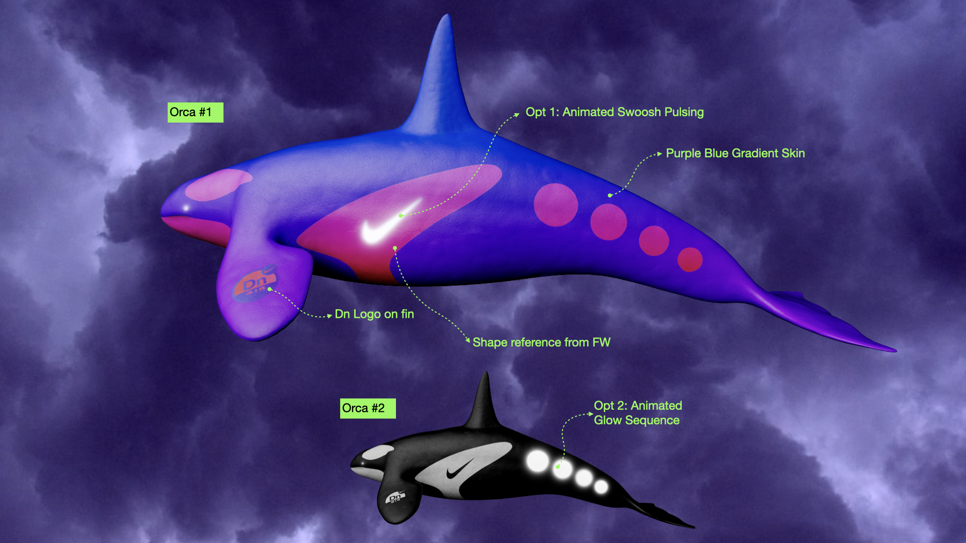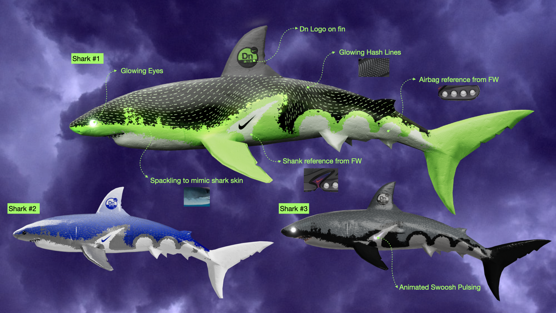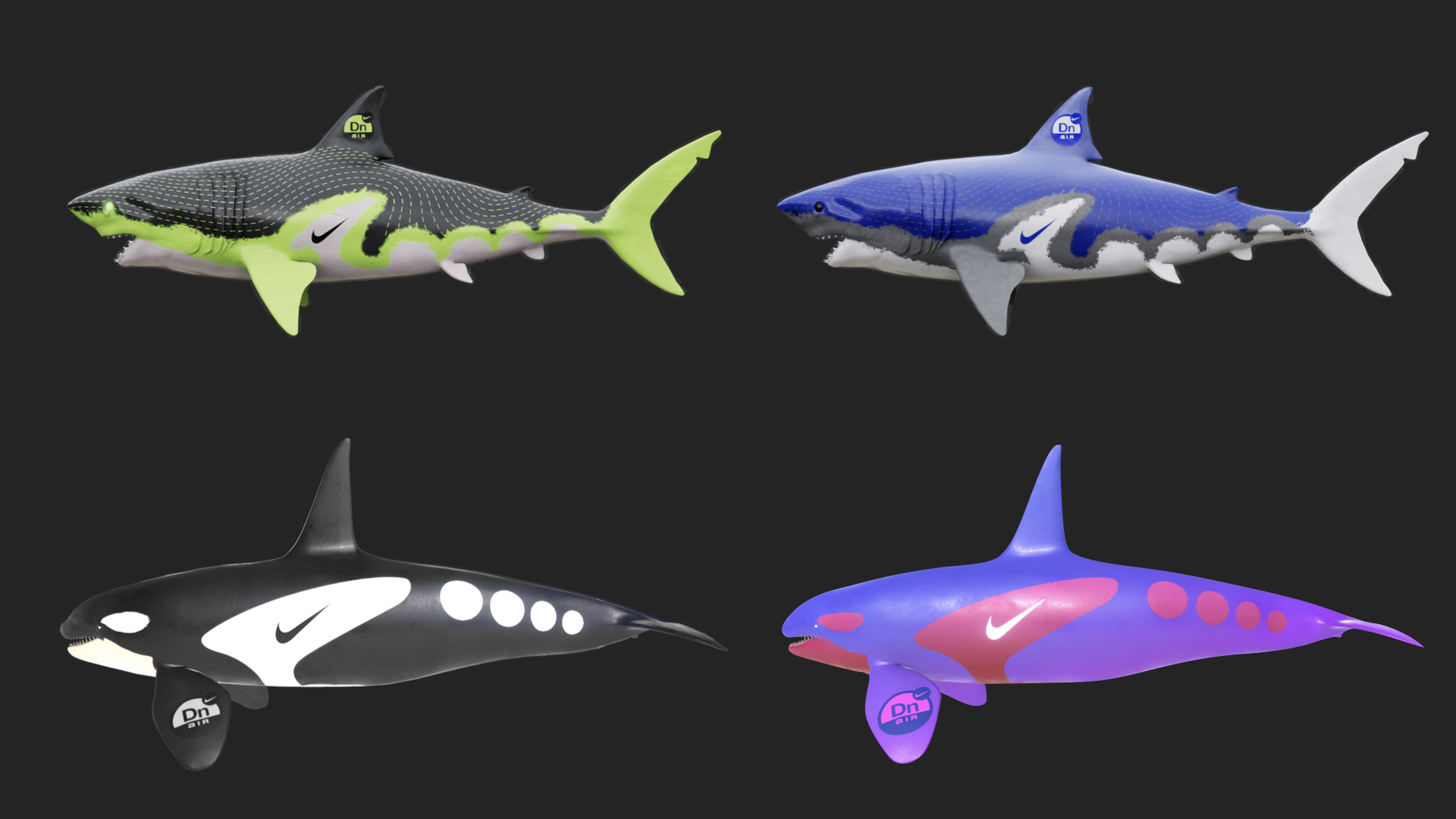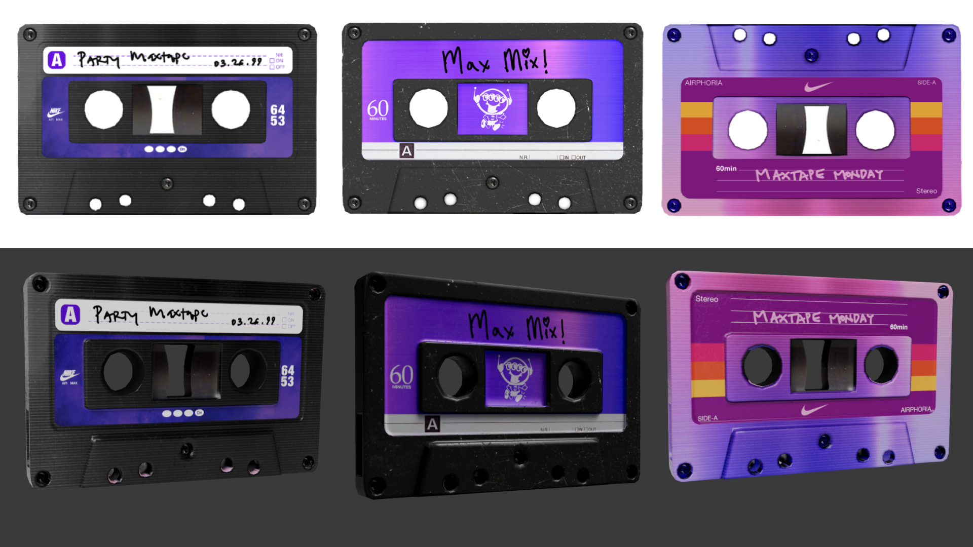 I designed a series of 3D assets to help bring the Airphoria world to life. Starting with the orcas and sharks. These were original designs, inspired by the form and features of the Air Max DN shoe and brought to life as sculptural interpretations of the product’s internal colorway names. I created the concepts from scratch and textured them directly onto the models. For the “Maxtape,” a play on mixtape, I mocked up several versions, then developed the final textures for application onto 3D models, adding another playful layer to the world’s storytelling.